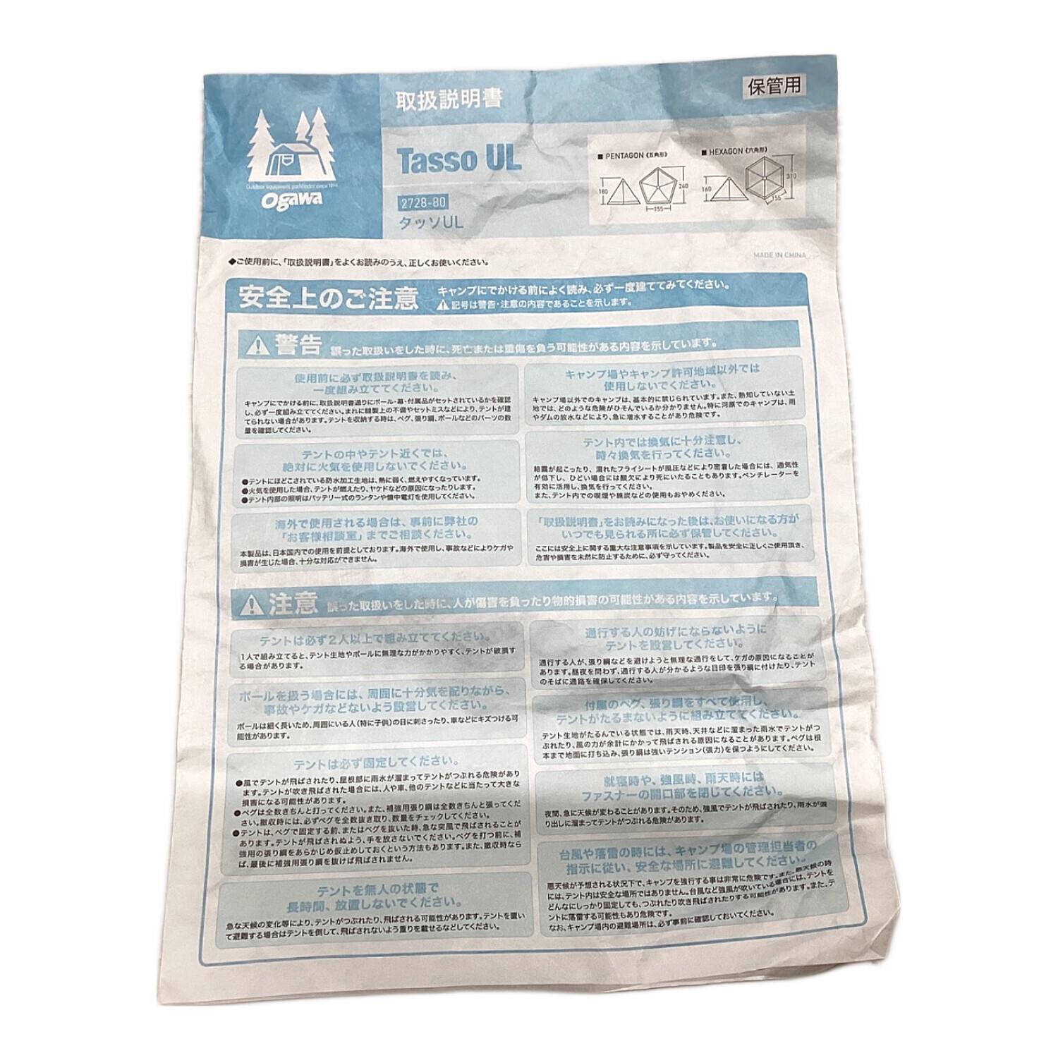 OGAWA (オガワ) ソロテント 2728 タッソUL 約240×155×180(h)㎝/約310×155×160(h)㎝ 1~2人用