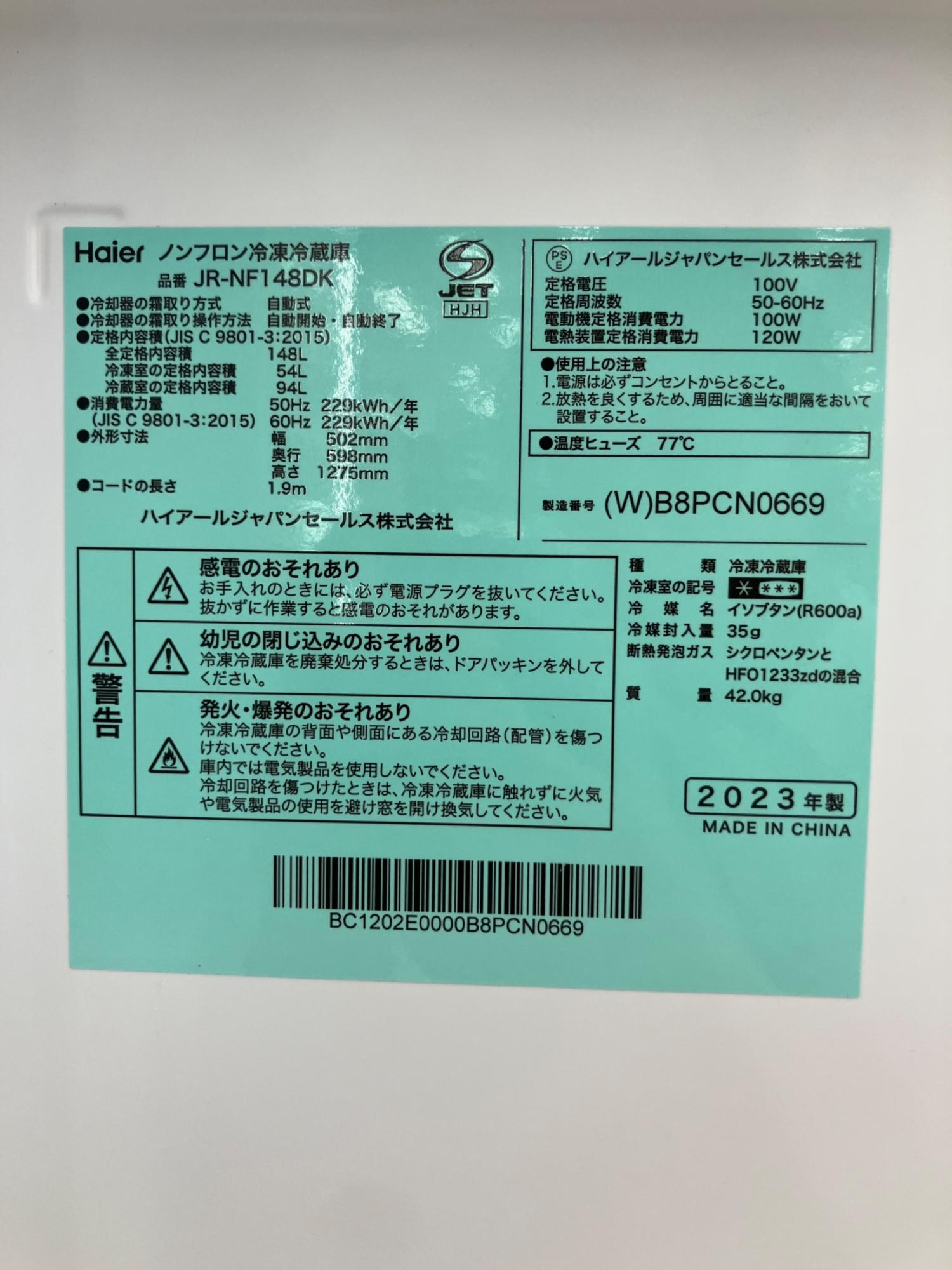 Haier (ハイアール) 2ドア冷蔵庫 JR-NF148DK 2023年製 148L