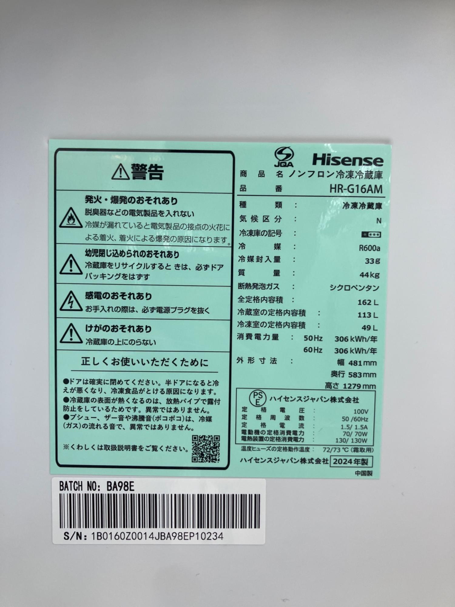 Hisense (ハイセンス) 2ドア冷蔵庫 HR-G16AM 2024年製 ガラストップ 162L