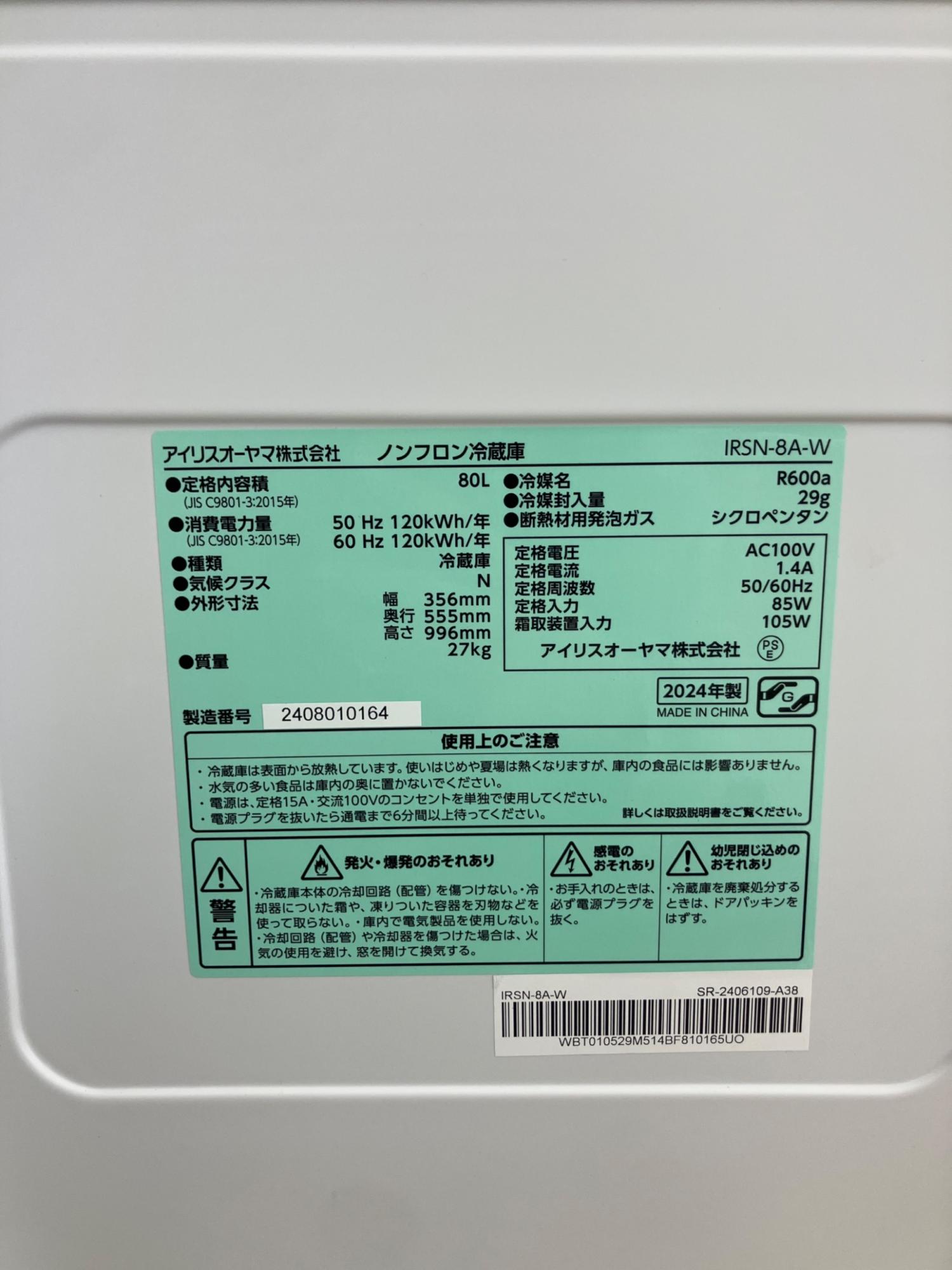 IRIS OHYAMA 1ドア冷蔵庫 IRSN-8A-W 2024年製