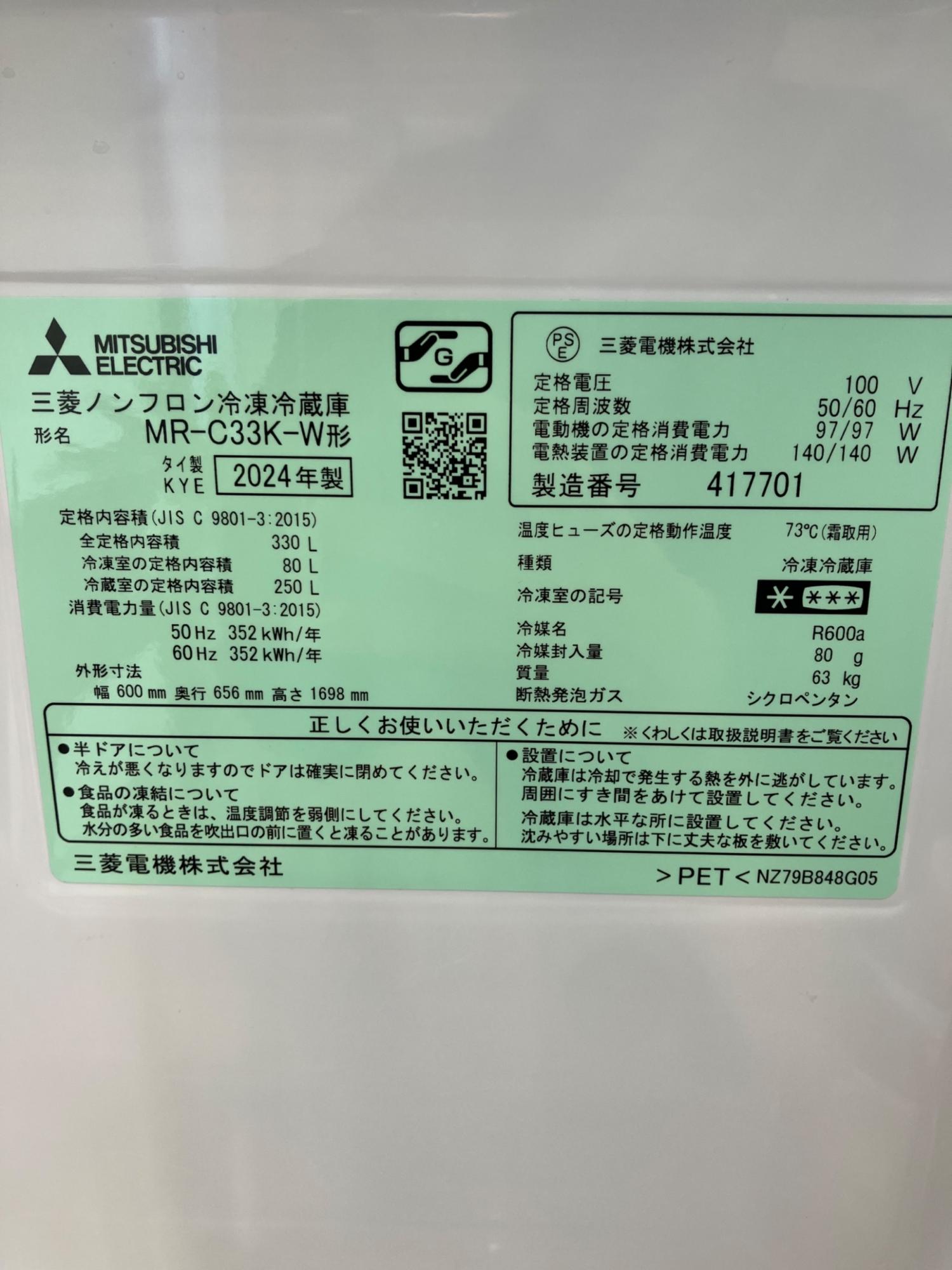 MITSUBISHI (ミツビシ) 3ドア冷蔵庫 MR-C33K 2024年製 330L