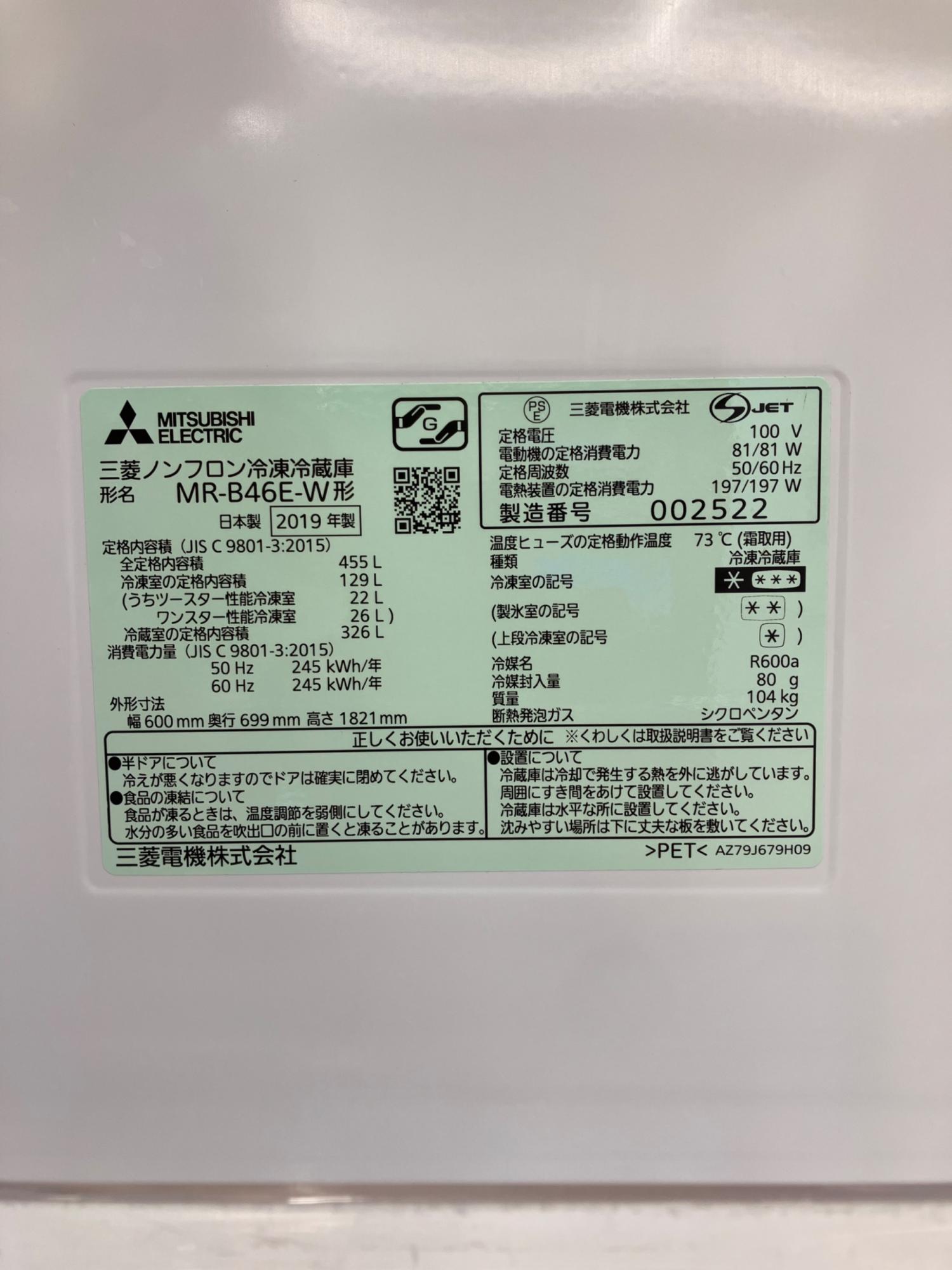 MITSUBISHI (ミツビシ) 5ドア冷蔵庫 455L 2019年製 MR-B46E