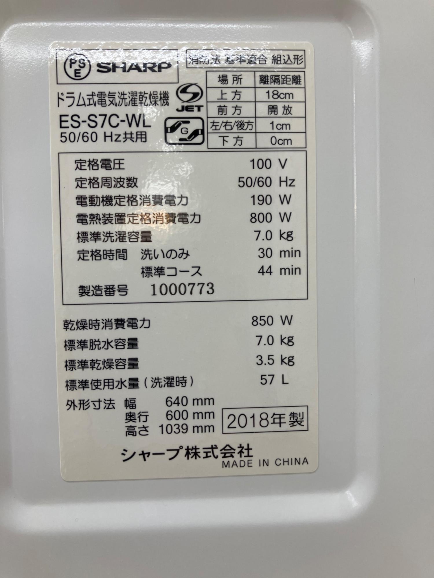 SHARP (シャープ) ドラム式洗濯乾燥機 洗濯容量7.0kg 乾燥容量3.5kg 2018年製 ES-S7C-WL