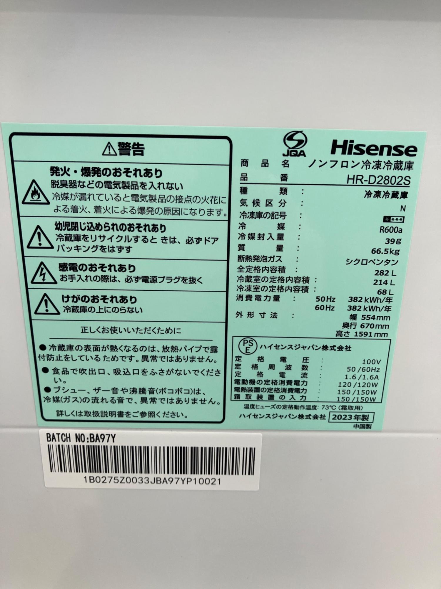 Hisense (ハイセンス) 3ドア冷蔵庫 HR-D2802S 2022年製 282L